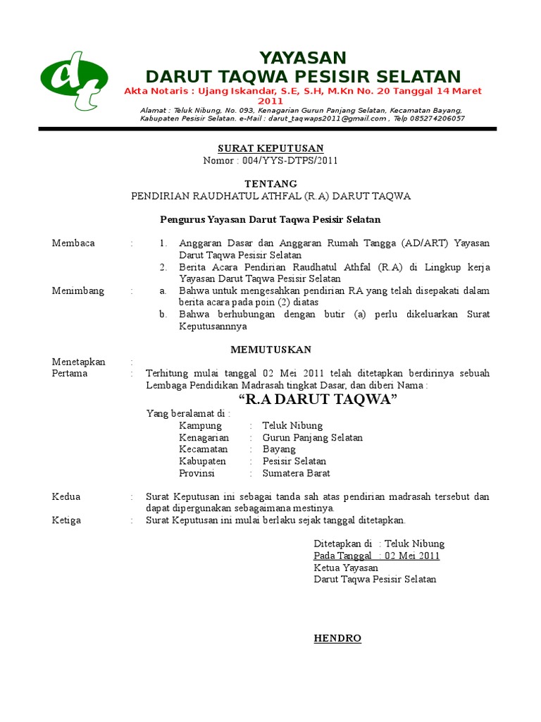 / Sk Pendirian Sekolah Dari Yayasan Doc : Contoh Sk Pendirian Paud Tk Kb Tpa Sps Format Word Paud Pendidikan Anak Usia Dini / Sk susunan kepanitiaan pendirian dan pembangunan pondok download sk susunan kepanitiaan pendirian dan pembangunan pondok download format surat lain: